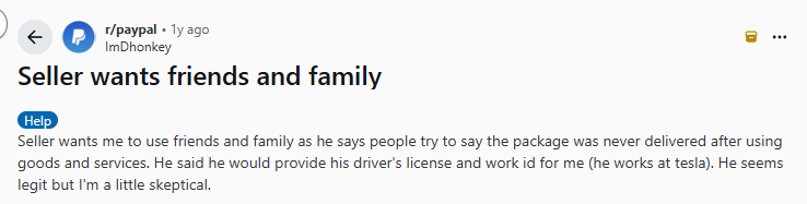 Ein Käufer bittet darum, die Option „Freunde & Familie“ zu nutzen, um Ihnen Gebühren zu sparen, beanstandet dann aber die Transaktion, nachdem er die Ware erhalten hat.